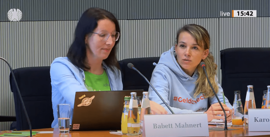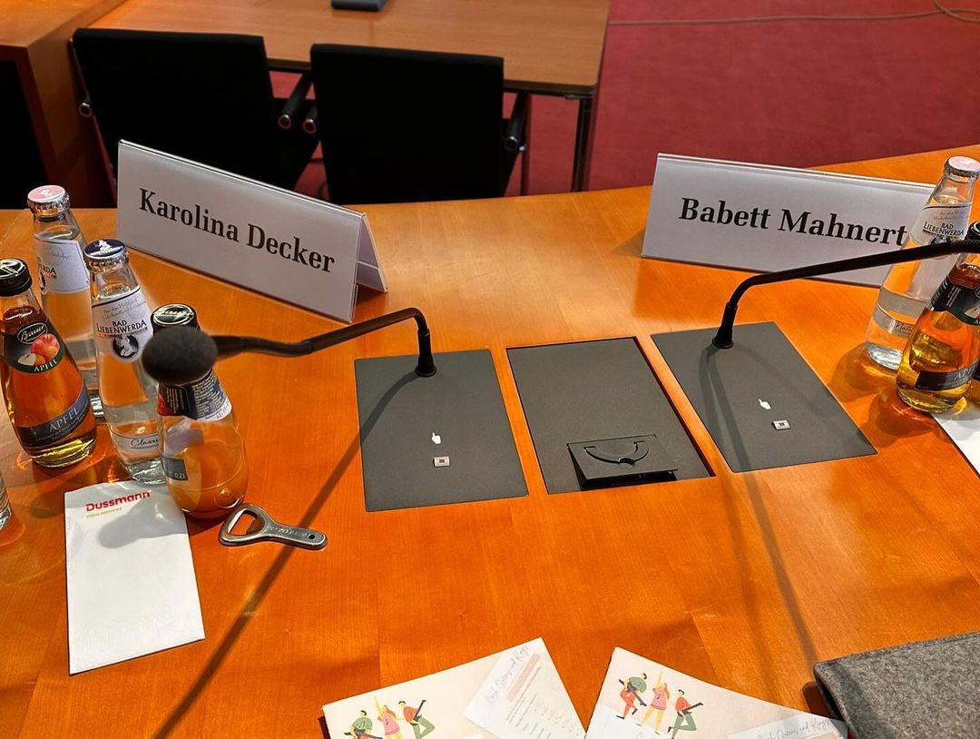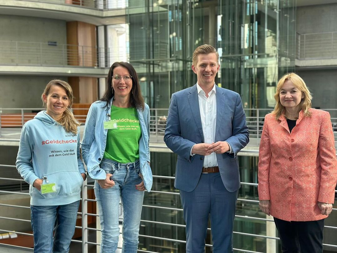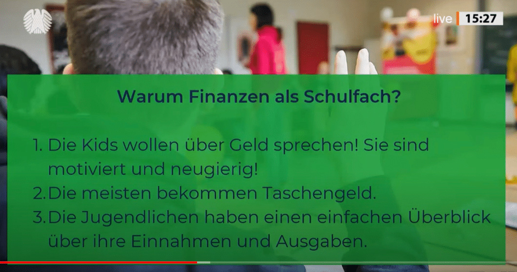 Es handelte sich um ein öffentliches Fachgespräch mit drei Expertinnen: Dr. Donate Kluxen-Pyta von der Bundesvereinigung der Deutschen Arbeitgeberverbände (BDA) und Babett Mahnert und Karolina Decker, die Gründerinnen von Schulgold, einer Organisation, die interaktive Finanzworkshops für Kinder, Jugendliche und Eltern anbietet.